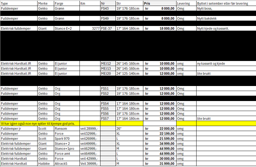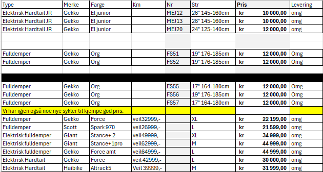 Vi har lagt ut enda flere sykler for salg, nå også junior fulldemper og el-sykkel. Førstemann til mølla gjelder, og bestilling tas på mail. Send type sykkel, rammestørrelse og eventuelt nummer på sykkelen du vil kjøpe til trysil@sport1.no. Vi tildeler sykler ut fra når mailene kommer inn, og du får svar på mail. Syklene får en enkel service før levering. Det gis ikke garanti på kjøp av brukte sykler.